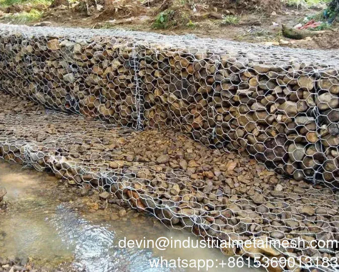 ガビオンボックスは、二重ねじり六角形金網で作られた長方形のユニットで構成され、石で満たされています。構造を強化するために、その端は金網ワイヤーよりも太い直径のワイヤーで補強されています。ガビオンボックスは、1メートルごとに隔壁によってセルに分割されます。
